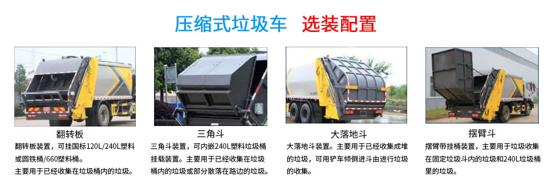 選裝配置:可選掛桶架、三角斗、全密落地斗、擺臂裝置。