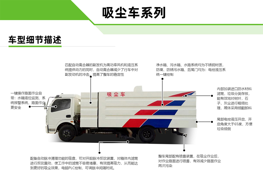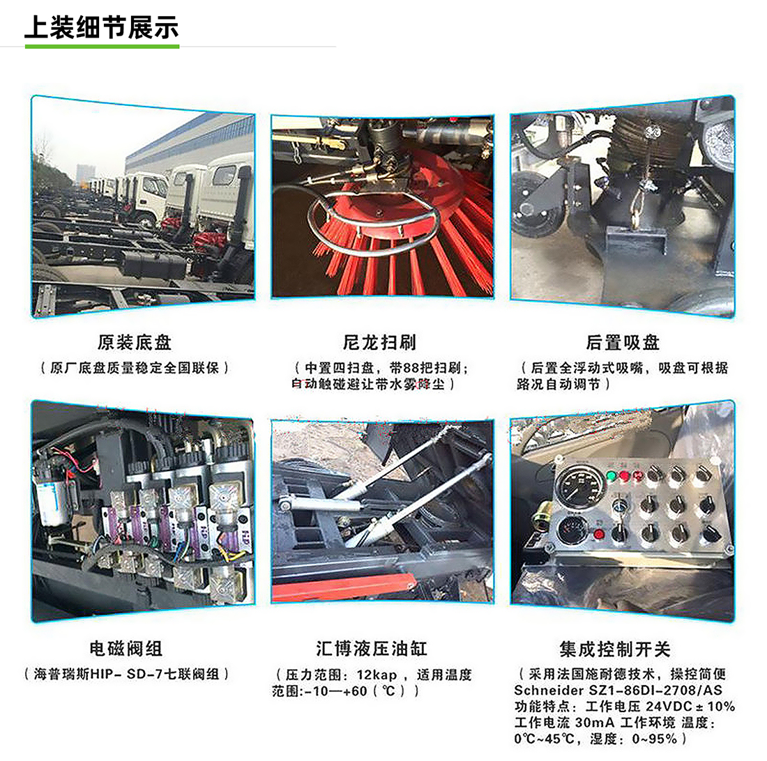 東風(fēng)小多利卡5方吸塵車專用配置:塵箱:4立方米,水箱:1立方米;中置吸盤、江鈴五十鈴副發(fā)動機(jī)、施耐德控制開關(guān)、海普瑞斯電磁閥組、無級變速自動離合器、免維護(hù)離心式風(fēng)機(jī)、高精度垃圾箱過濾系統(tǒng)(最高可達(dá)0.5微米),不銹鋼垃圾箱、進(jìn)口脈沖閥、垃圾箱舉升自卸、尾部LED箭頭燈、車尾霧狀噴水潤濕功能、倒車影像、手動泵應(yīng)急系統(tǒng)。
